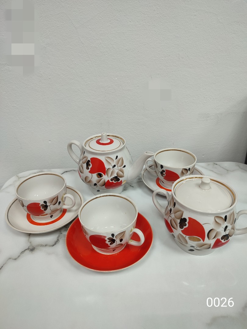 Прокопьевский завод, СССР, "Красный перец", 1976 г. Чайник - 1 шт, сахарница (без крышки) - 1 шт, чашки - 3 шт, блюдце (внутри красные) - 1 шт, блюдце (белые) - 2 шт.